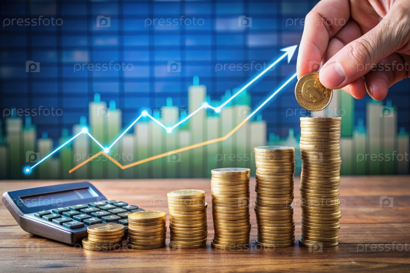 Размещение золотой монеты на стеке монет с графиком восходящего тренда в фоновом плане