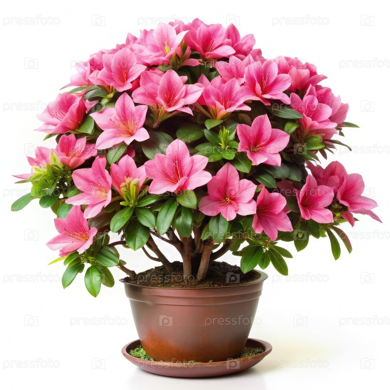 Растение розовой азалии в коричневом горшке на белом фоне