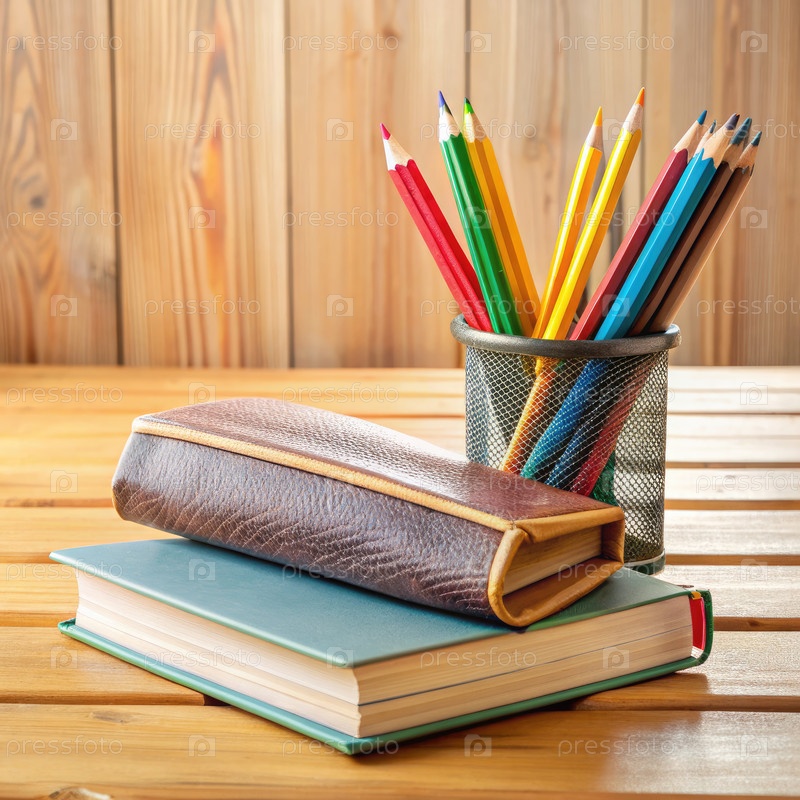 Куча книг, корпус для карандашей и цветные карандаши на деревянном столе