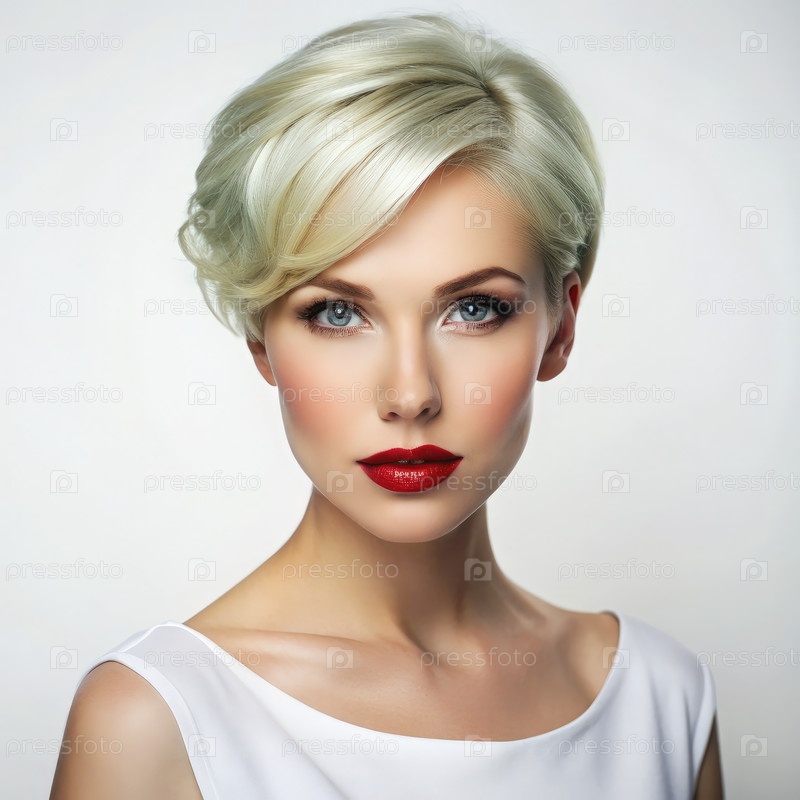 Блондинка с короткой прической и красной помадой позирует для портрета