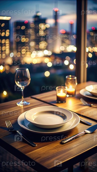 Пустая обеденная тарелка на деревянном столе с видом городских огней ночью. генеративный ИИ