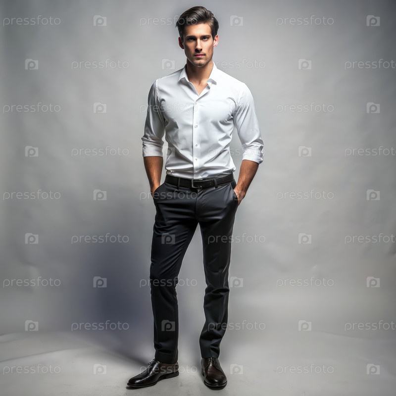 Тонкий мужчина в белой рубашке и черных штанах позирует на сером фоне