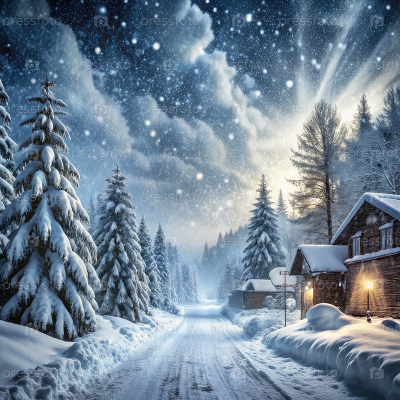 Снежная лесная дорога и уютный домик в сумерках