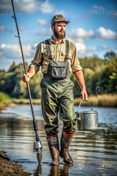 Рыбак ходит по мелкой воде со своим снаряжением