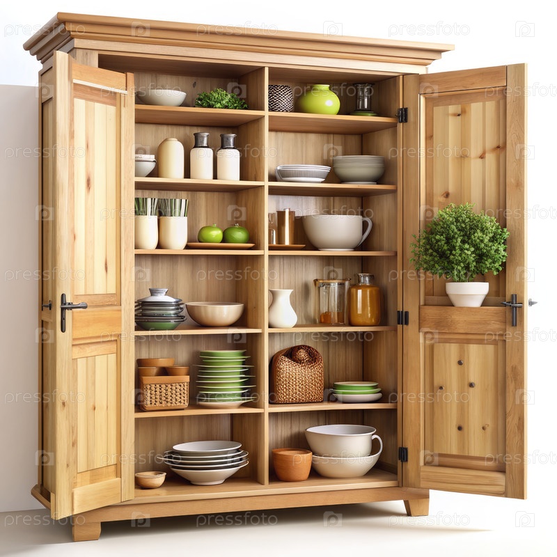 Деревянный кухонный шкаф с открытой дверью и хранилищем на полке