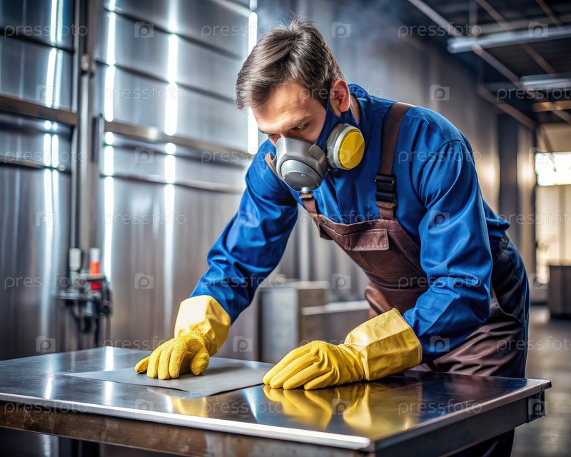Промышленный работник, носящий защитное снаряжение, инспектирует металлическую поверхность на фабрике