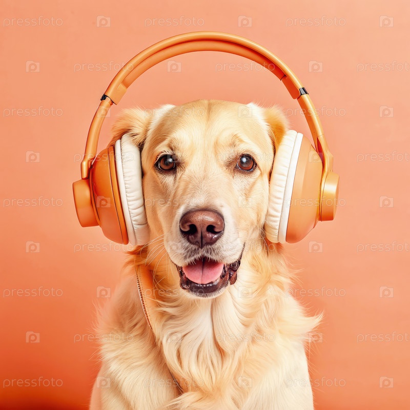 Золотой ретривер носит наушники на оранжевом фоне