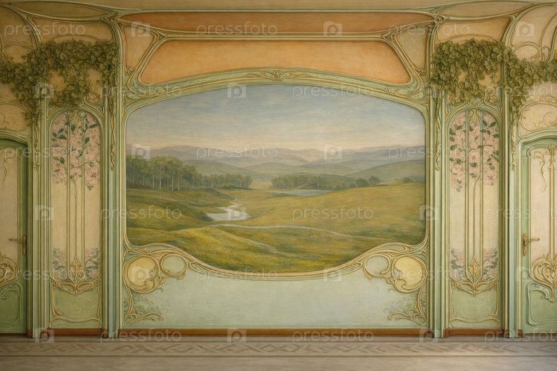 Пасторальная пейзажная фреска, изображающая раскачивающиеся зеленые холмы и извивающуюся реку в стиле безмятежной панорамы сельской местности