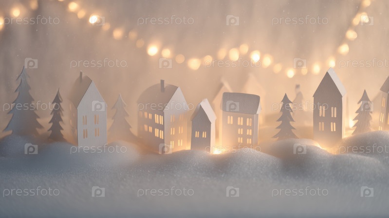 Минималистическая рождественская деревня с светящимися бумажными домиками, мягким снегом и теплыми фейри-лампами создает уютный фон зимних каникул