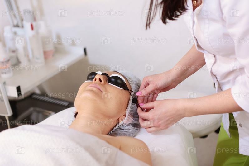 Подготовка к фотодинамической терапии. Пациент носит защитные очки. Молодая женщина проходит лечение лица. Концепция красоты и благополучия