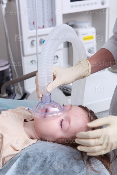 Ребенок находится под анестезией. Дыхательная маска на лице маленькой девочки. Маленького ребенка готовят к операции. Концепция медицинской помощи