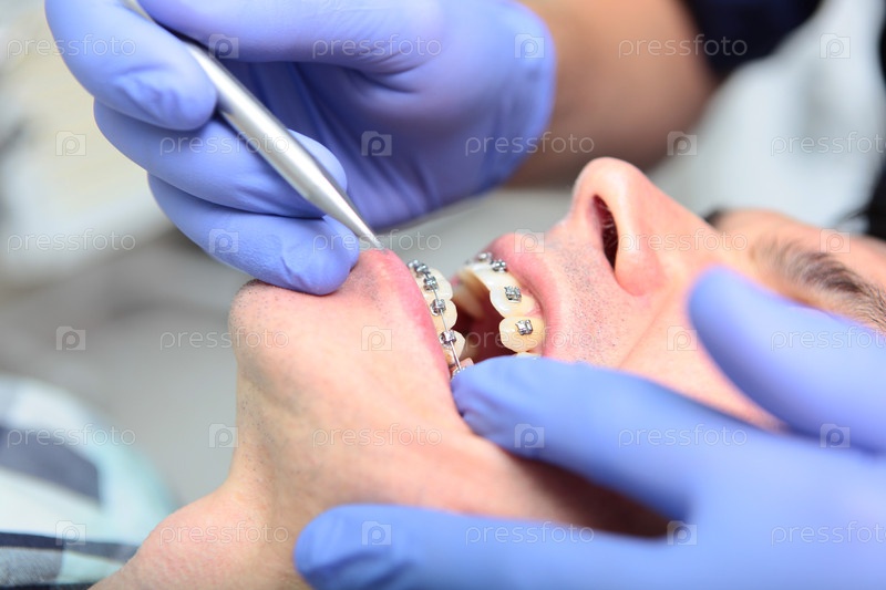 Мужчина с металлическими брекетами на зубах проходит ортодонтическое лечение. Установка брекетов на зубы. Концепция стоматологии, протезирования и ортодонтии. Коррекция зубов