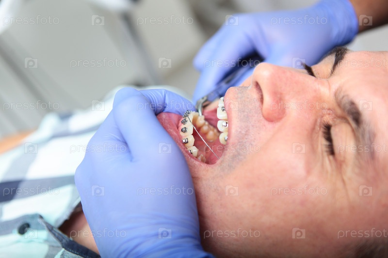 Мужчина с металлическими брекетами на зубах проходит ортодонтическое лечение.Концепция стоматологии, протезирования и ортодонтии