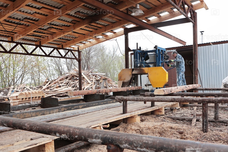 Рабочий управляет пиломашиной. Школа слесаря на открытом воздухе. Производство деревянных поддонов для перевозки тяжелых грузов. Концепция деревообработки