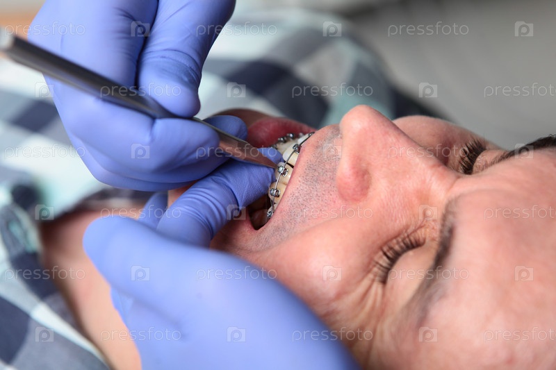 У мужчины на зубах брекет. Коррекция зубов. Мужчина с брекетом на зубах на встрече у ортодонта. Ортодонтическое лечение