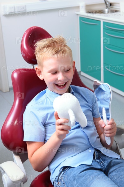 Маленький мальчик сидит в стоматологическом кресле. Ребенок играет со зонтообразным зеркалом и мягкой игрушкой. Удобное лечение молочных зубов. Ребенок находится у стоматолога