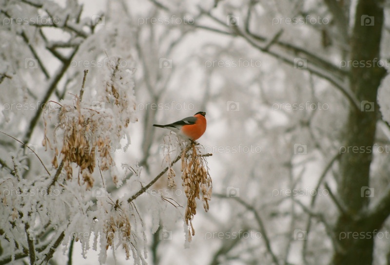Снегирь сидит среди белых и пушистых веток дерева