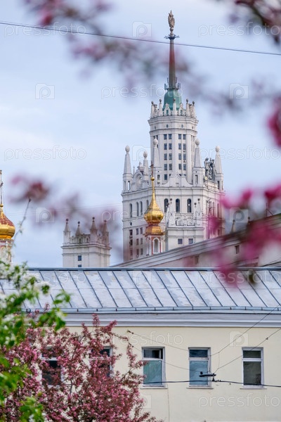 Высотка на Котельнической набережной через цветы розовой яблони