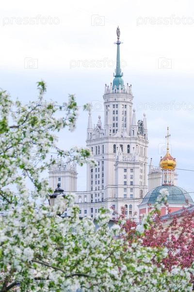 Высотка на Котельнической набережной через цветы розовой яблони