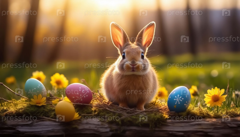 Деревянный стол с украшенными пасхальными яйцами на фоне природы