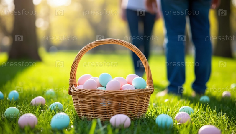 Пара наслаждается пасхальным пикником на зеленой траве с красочными яйцами Солнечный уикенд