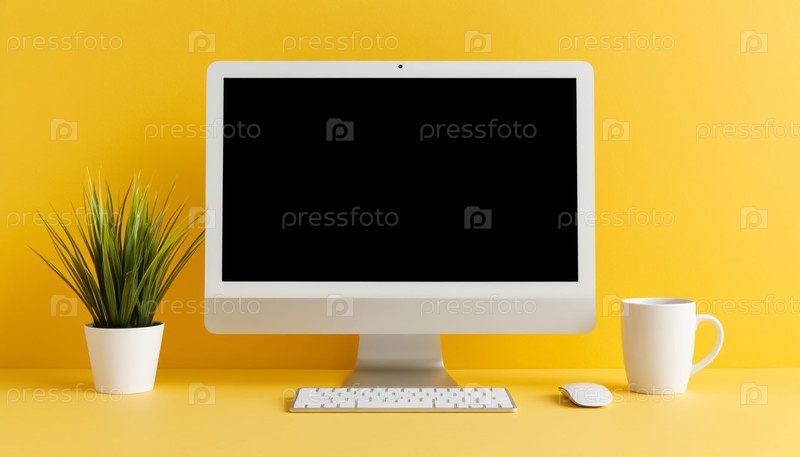 Компьютерный монитор клавиатуры и мыши на желтом фоне, современная установка рабочего пространства