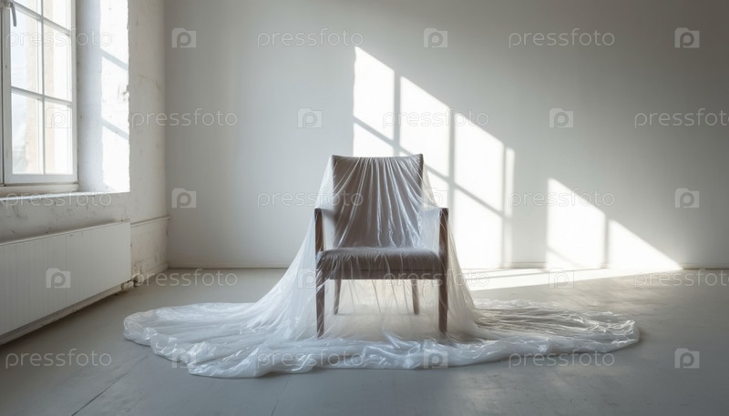 Пустой белый стул для комнаты, обтянутый пластиковым листом