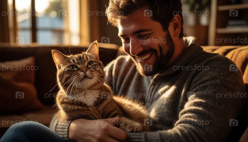 Счастливый владелец кошки с домашним животным на руках сидит на диване