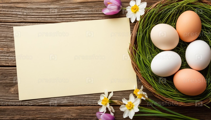 Минималистский макет пасхальных карточек на столе из натурального дерева, концепция весеннего украшения