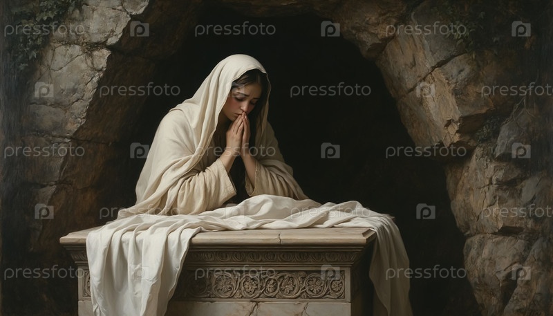 Мария Магдалина плачет в Иисусе Могила Опирается на полотенце Христианское искусство Print