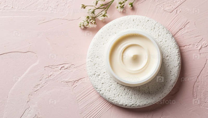 Женский крем по уходу за кожей в упаковке, выставленной на стенде из натурального камня