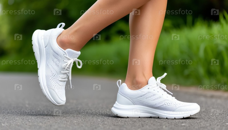 Женские ноги, бегущие в белых кроссовках Motion Sport