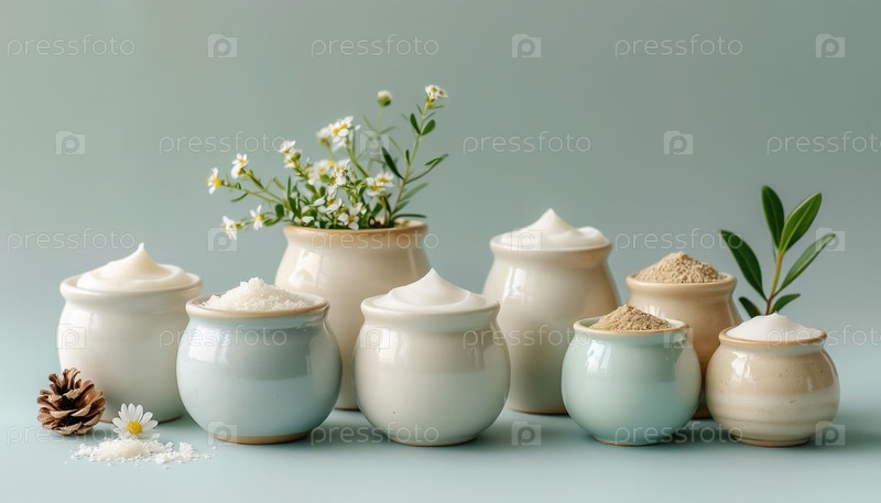 Естественный косметический продукт в керамических банках кремом, пастельным фоном минимализма
