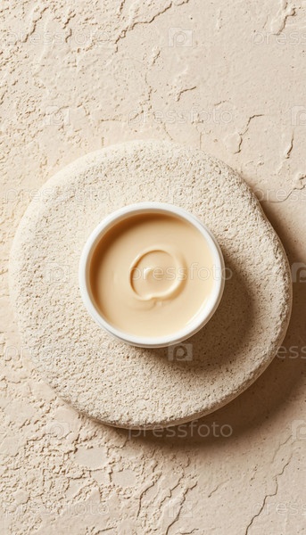 Крем в белом баке на минималистическом светло-бежевом фоне