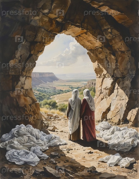 Женщины в библейском гаребе обнимаются в пещере пустые белые простыни на земле