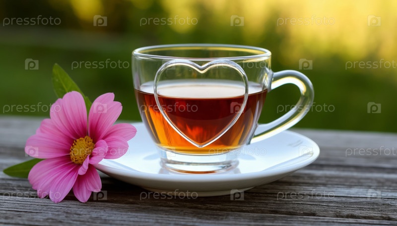 Травяной чай в прозрачной стеклянной чашке с парным формированием формы сердца, романтическая концепция
