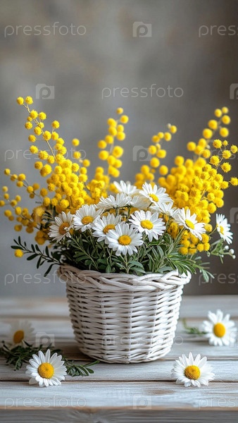 Мимоза и ромашки в плетеной корзинке. Цветочная композиция из мимозы и ромашек в подарок женщине. Международный женский день 8 марта