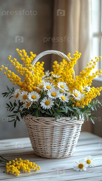Мимоза и ромашки в плетеной корзинке. Цветочная композиция из мимозы и ромашек в подарок женщине. Международный женский день 8 марта