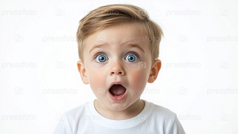 Удивленный маленький мальчик на белом фоне. Портрет удивленного мальчика. Смешной ребенок открыт рот от удивления