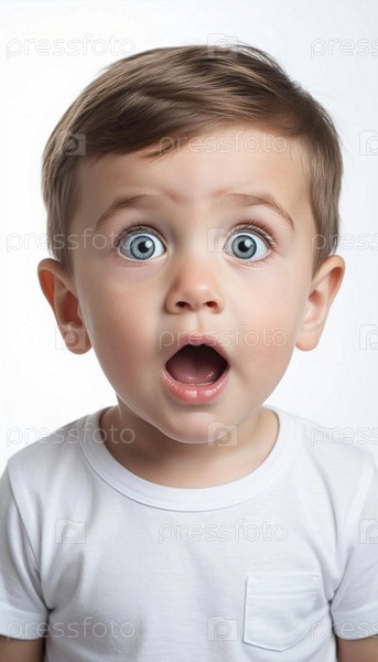 Удивленный маленький мальчик на белом фоне. Портрет удивленного мальчика. Смешной ребенок открыт рот от удивления