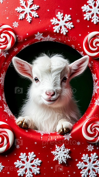 Символ 2027 года - Коза, белого цвета, в упаковочной бумаге. Пушистый белый козленок, смотрящий в камеру. Подарок на Новый год. Белая коза на темном фоне