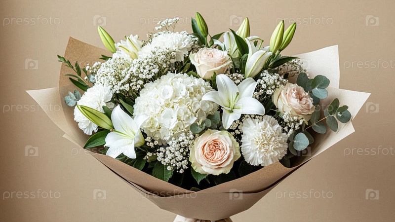 Большой букет белых цветов. Объемный букет из лилии, розы, гипсофилы, гортензии и других цветов светлых оттенков. Букет цветов белого цвета крупным планом на бежевом фоне