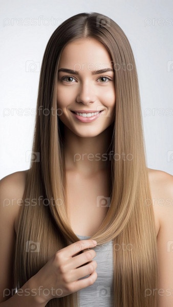 Улыбающаяся молодая девушка с длинными прямыми светлыми волосами. Модель. Портрет девушки с длинными волосами на белом фоне