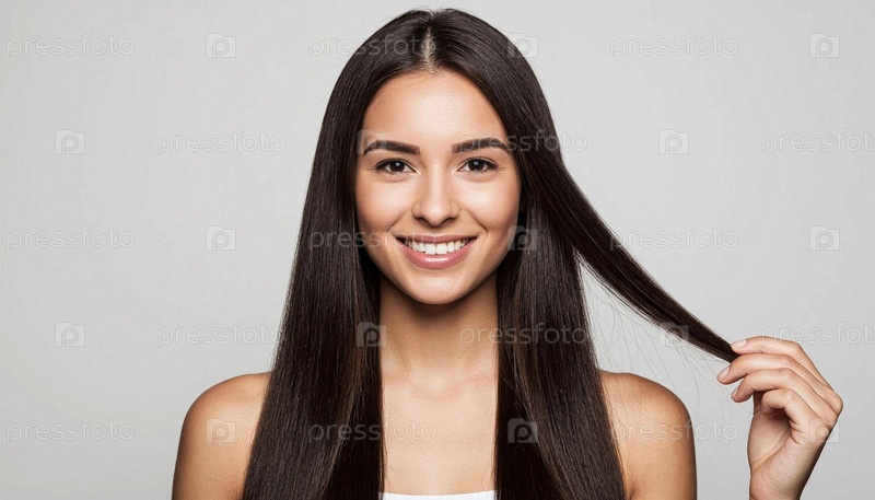 Улыбающаяся молодая девушка с длинными прямыми светлыми волосами. Модель. Портрет девушки с длинными волосами на белом фоне