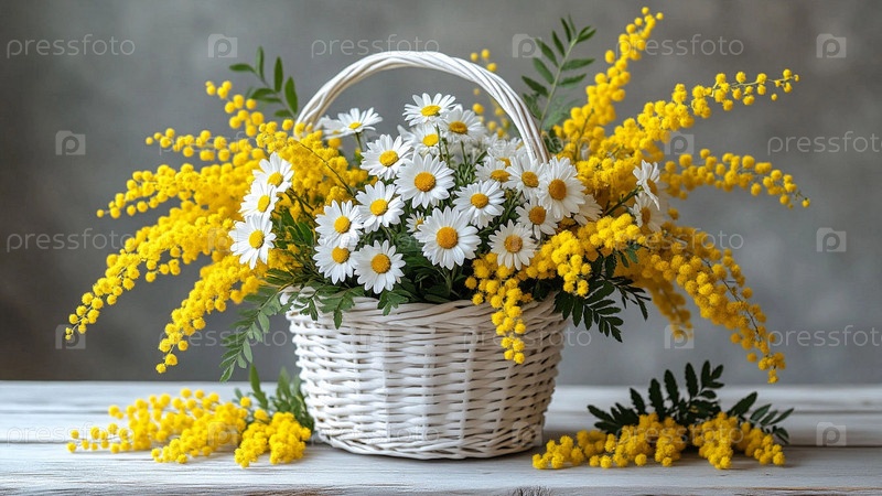 Мимоза и ромашки в плетеной корзинке. Цветочная композиция из мимозы и ромашек в подарок женщине. Международный женский день 8 марта