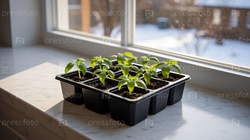 Молодой растущий росток растения, макросъемка саженца на подоконнике в стаканчике. Рассада крупный план