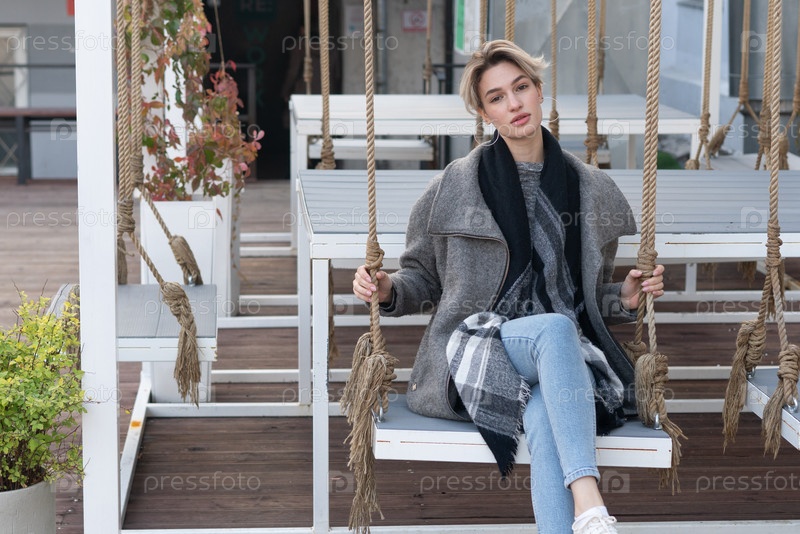 Молодая красивая женщина позирует в сером пальто снаружи
