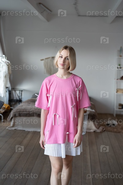 Молодая красивая женщина позирует в розовой футболке в студии