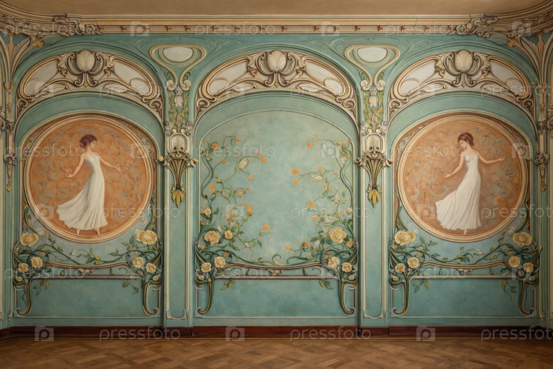 Элегантная стеновая роспись интерьера в стиле модерн с украшенными цветочными панелями и классическими женскими фигурами в винтажном декоративном салоне