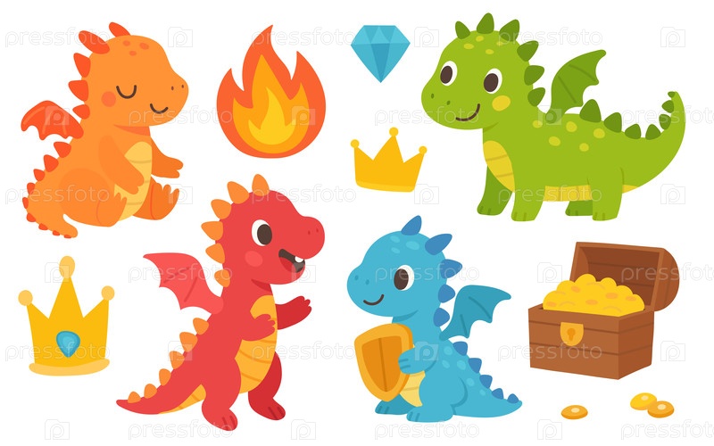 Красивый набор мультфильмов о драконах с короной, сокровищницей и огненным пламенем, магический фэнтезийный клипарт для темы дня рождения и проектов книг-рассказок